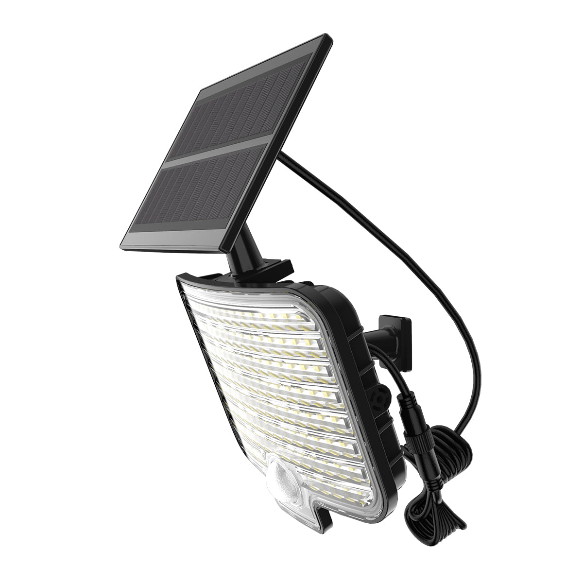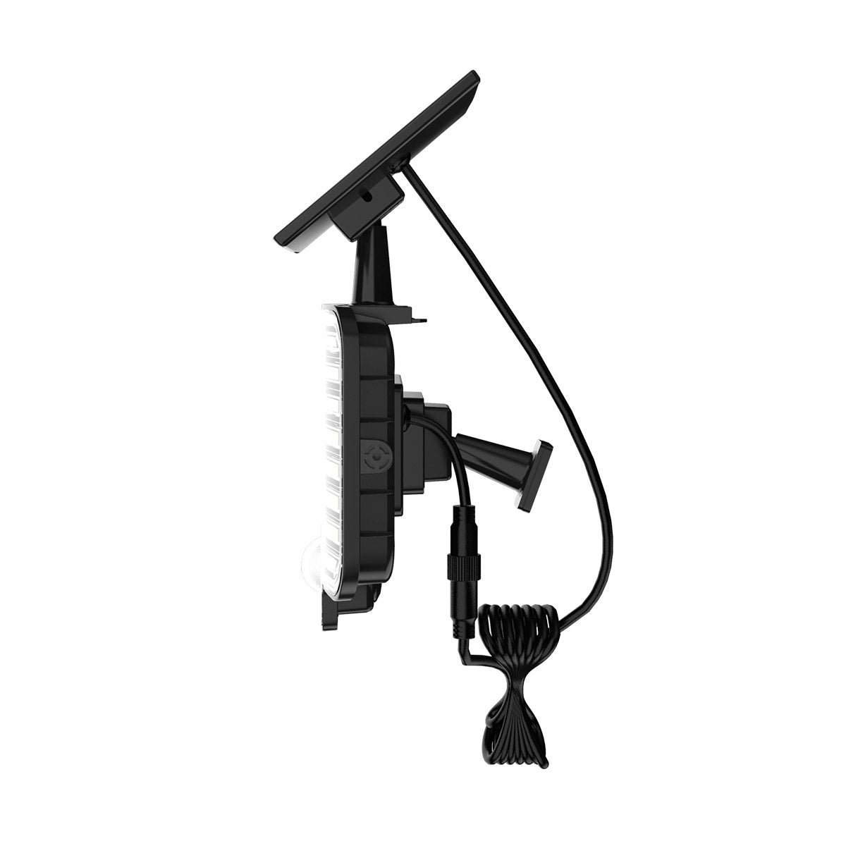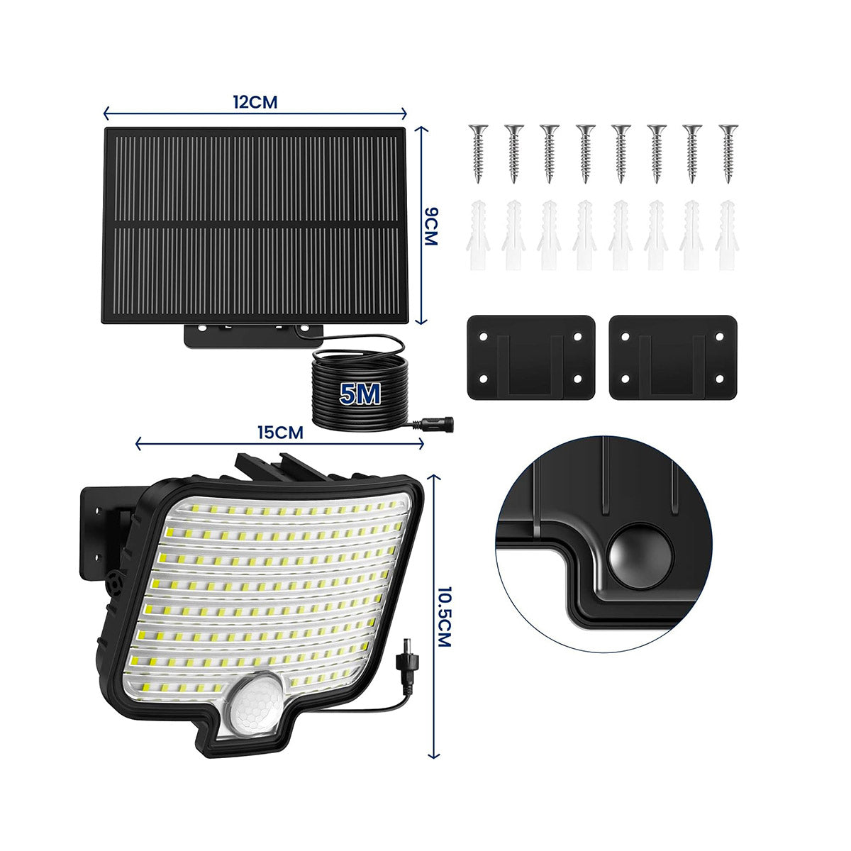 - Caractéristiques : Dimensions du produit: 15 x 10x 12,3 cm, Indice de protection (IP) IP44 - Couleur : Noir - Nb de LED : 120LEDs - Fonctions : avec détecteur de mouvement, 120 degrés de détection, Réglable - Type de prise : Panneau solaire - Batterie : Lithium 2200mAh - Volt 3,57 - Puissance ; 5,5W - Usage : extérieur - Flux lumineux : 550 LM - Panneau solaire (13,7x8,5cm)