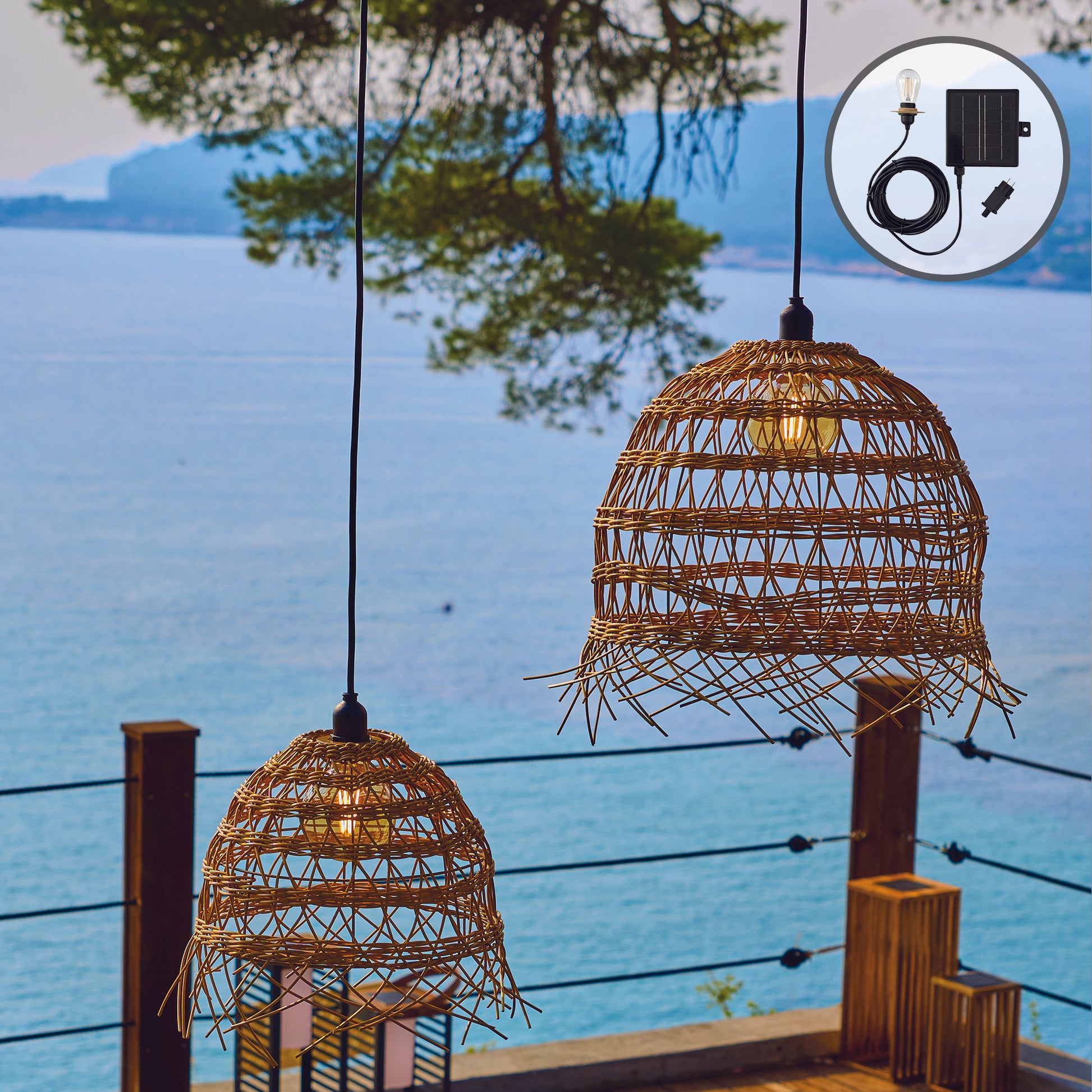 Lot de 2 suspensions solaires 2X HAWAII LONG SOLAR en poly rotin avec câble hybride secteur et solaire 5m de longueur